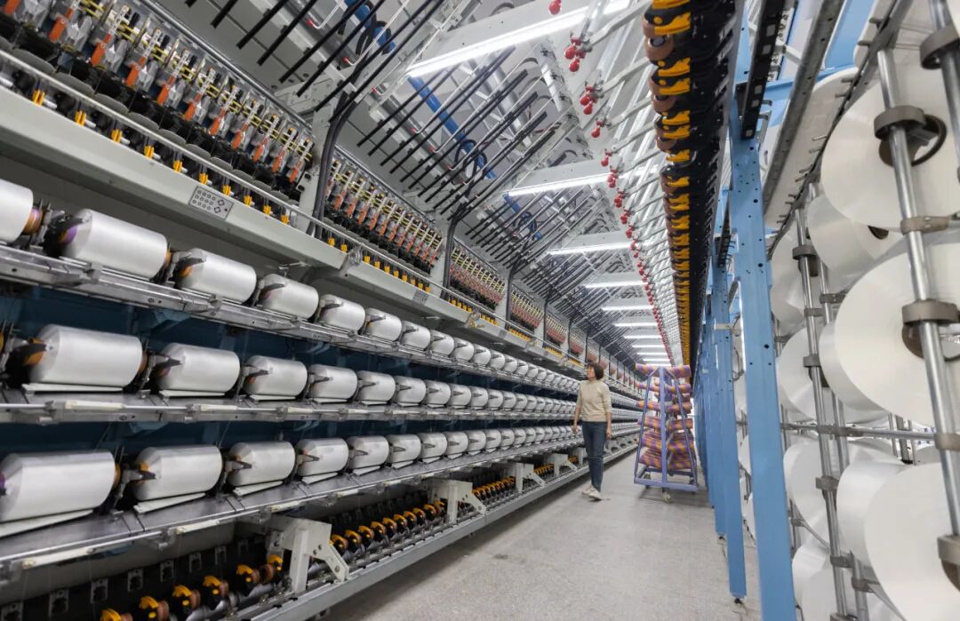 湖北省三圓紡織科技有限公司生產車間,加彈機“吐出”一卷卷錦綸長絲。