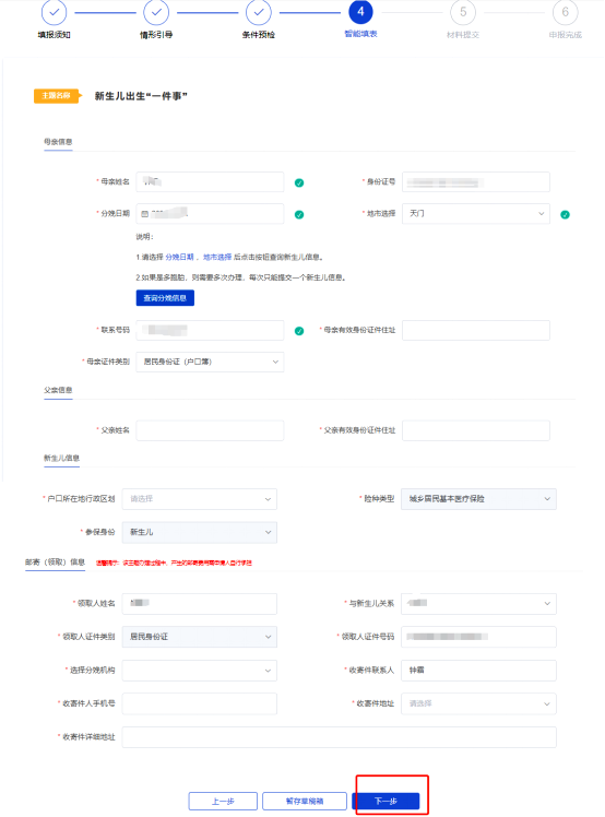 第四步:完成條件預檢后點擊“下一步”按鈕進入主題填報頁面,按照提示填寫“一張表”后點擊“下一步”按鈕進入材料上傳頁面。