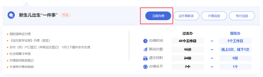第二步:選中需要辦理的“一件事”主題,此處以“新生兒出生一件事”為例,在國家重點事項版塊找到新生兒出生“一件事”主題,點擊后方“立即辦理”按鈕開始辦理。