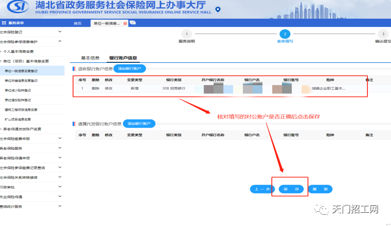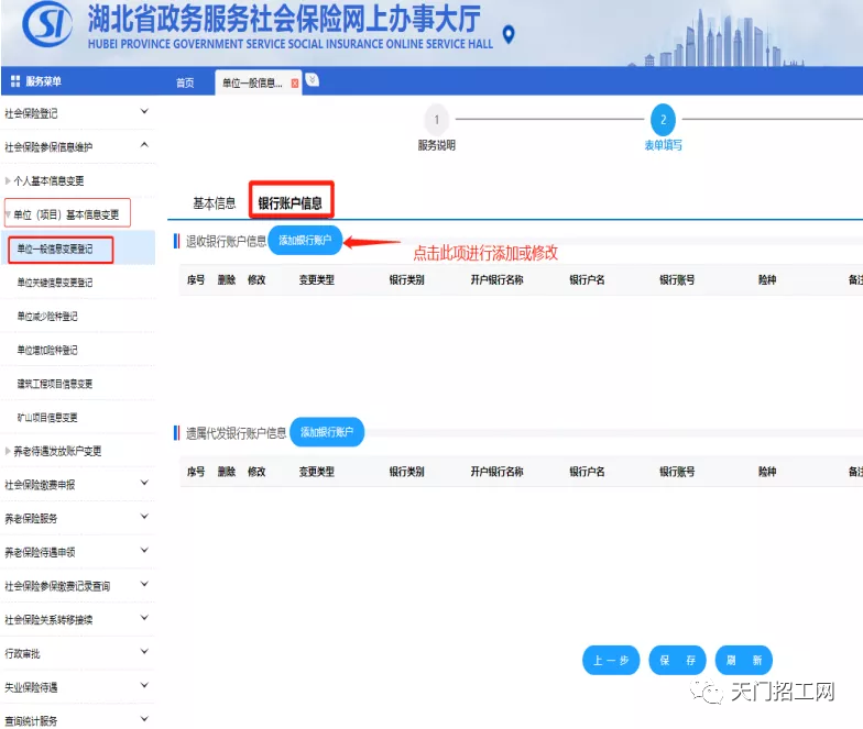 請登錄湖北政務服務網,點擊“企業職工養老保險信息系統”,進入“湖北省政務服務社會保險網上辦事大廳”,點擊“單位(項目)基本信息變更”中“單位一般信息變更登記”,進入“銀行賬戶信息”湖北政務服務網:http://zwfw.hubei.gov.cn/