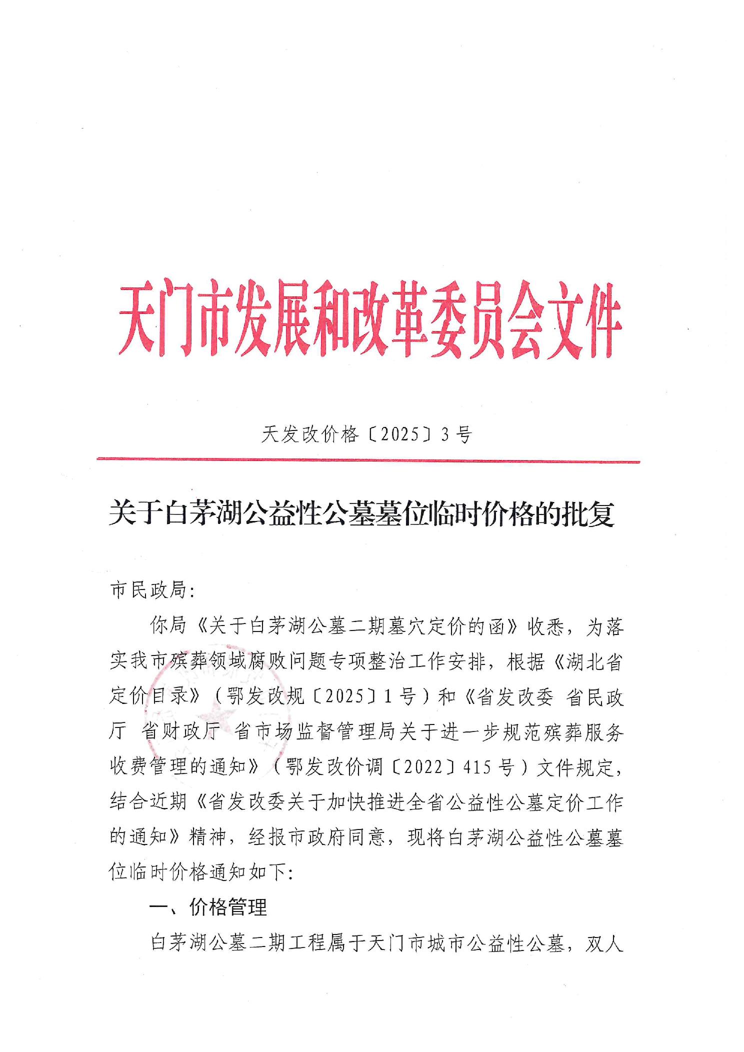 關于白茅湖公益性公墓墓位臨時價格的批復