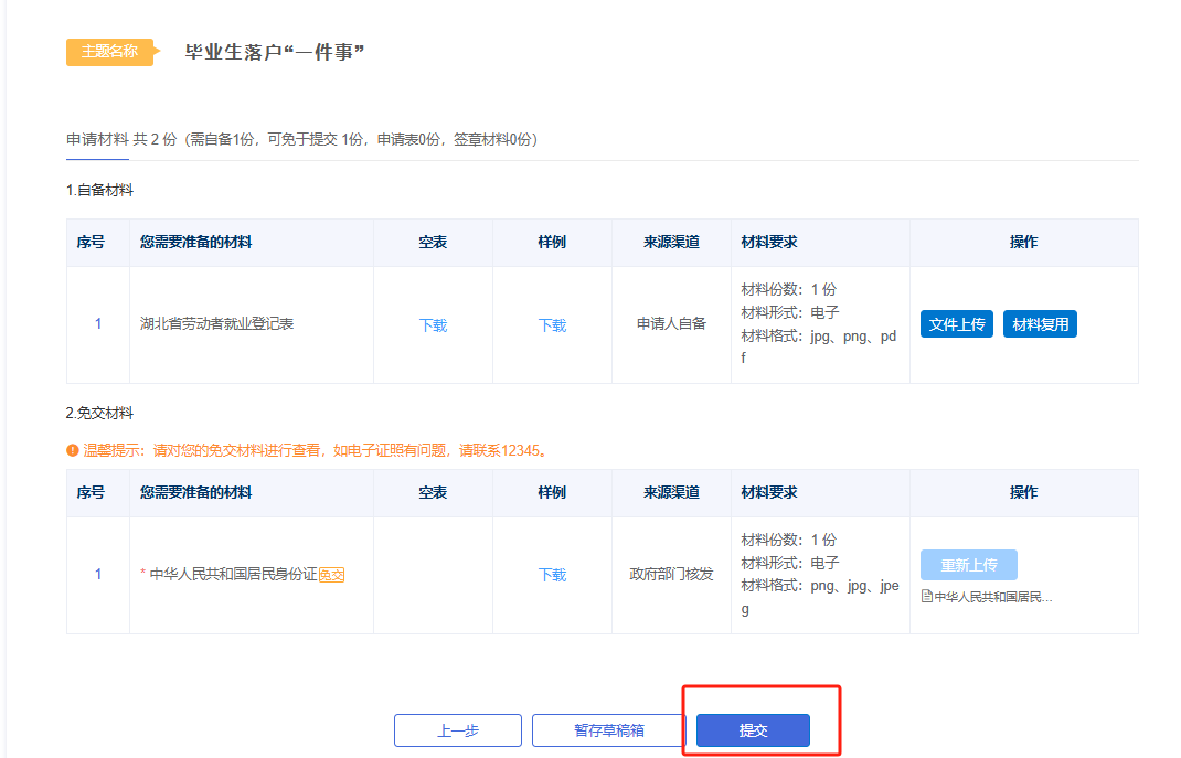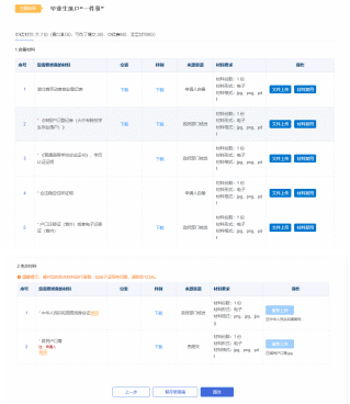 ①如果導引頁面勾選了“需要辦理個人就業登記和戶口遷移審批”此處需要上傳湖北省勞動者就業登記表、《申報戶口登記表(大中專院校學生畢業落戶)》、《普通高等學校畢業證書》學歷認證證明、合法穩定住所證明、戶口遷移證(省外)或者電子遷移證(省內)5項材料,身份證和居民戶口簿為電子證明調用“免提交”。