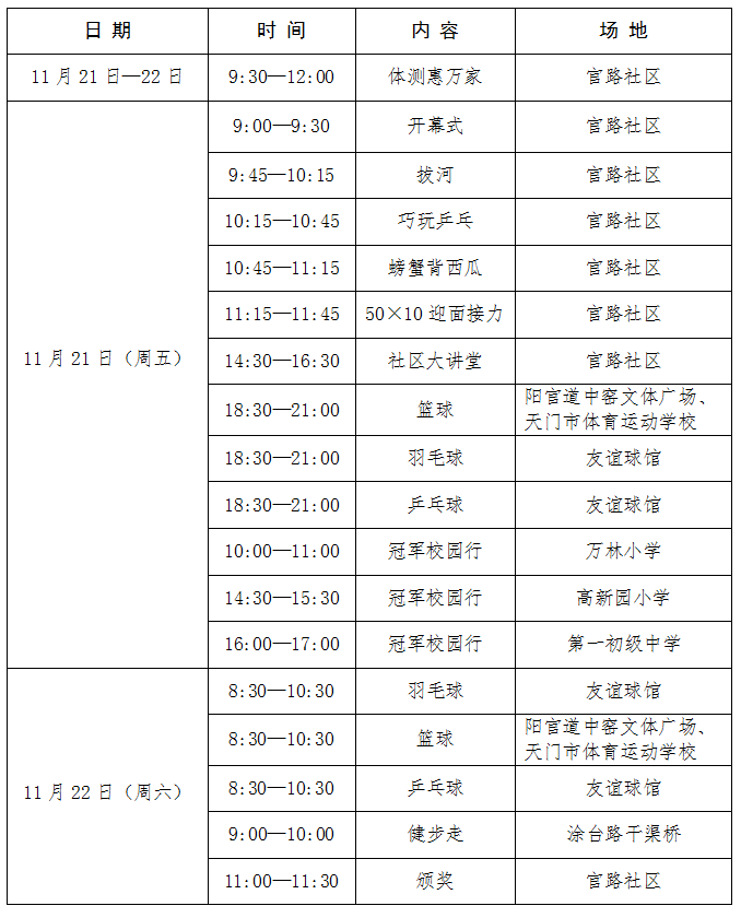 活動地點:天門市竟陵街道、官路社區、天門市體育中心、天門市體育運動學校、友誼球館