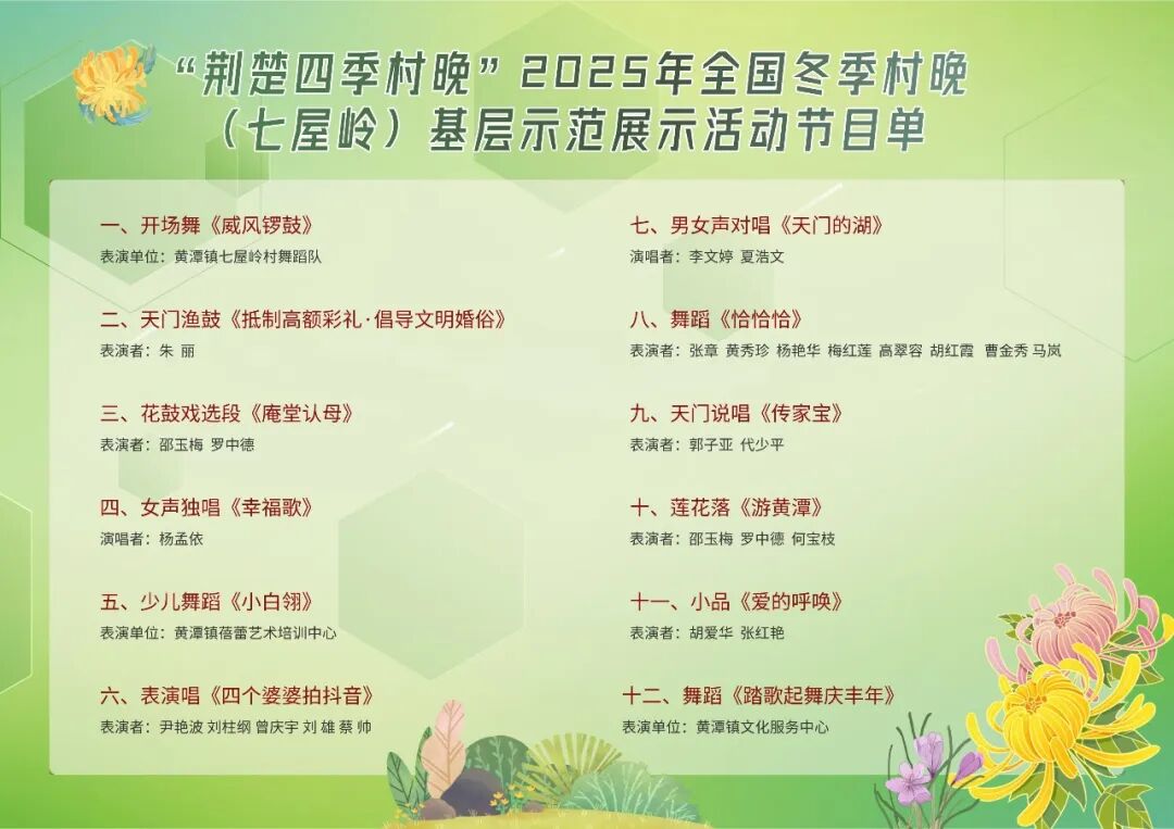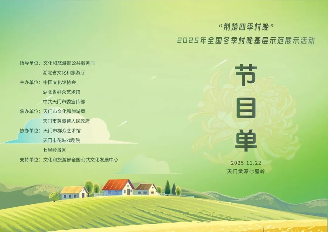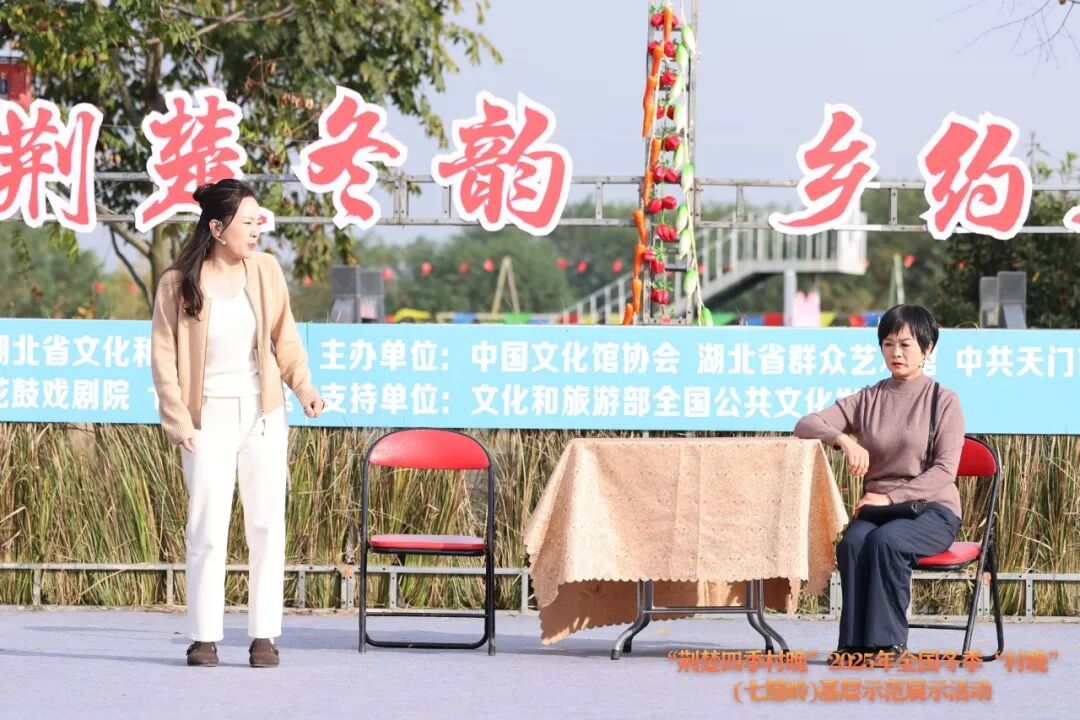 2025年全國冬季“村晚”基層示范展示活動于11月22日在湖北省天門市黃潭鎮(zhèn)七屋嶺景區(qū)圓滿落幕。現(xiàn)場群星薈萃、氣氛熱烈,得到了各級領(lǐng)導的高度重視與親切關(guān)懷。晚會尚未正式開始,現(xiàn)場早已坐滿了翹首以盼的村民們,村落中蔓延著濃厚的文化氛圍。
