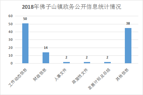 2018年佛子山鎮累計主動網上公開政府信息108條,其中政府工作及重點工作動態信息50條,財政信息14條,機構內部人事文件2條,政策文件2條,發展計劃及總結2條,其他信息38條,詳情見下圖: