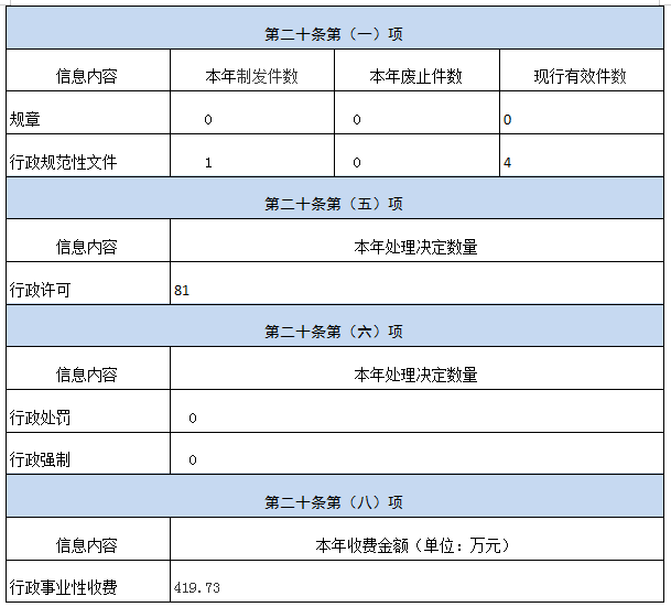2023年,現(xiàn)行有效行政規(guī)范性文件共4件;辦理行政許可事項審批81件,行政事業(yè)性收費?419.73萬元;無規(guī)章、行政處罰、行政強制等信息。