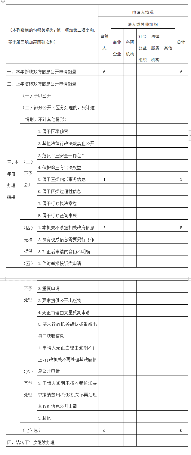 2.政府信息依申請公開情況。2023年,我局收到政府信息公開申請6件,申請涉及機構(gòu)改革和自來水水質(zhì)等,均按照《條例》規(guī)定辦結(jié)。全年因政府信息公開引發(fā)行政復(fù)議1起。