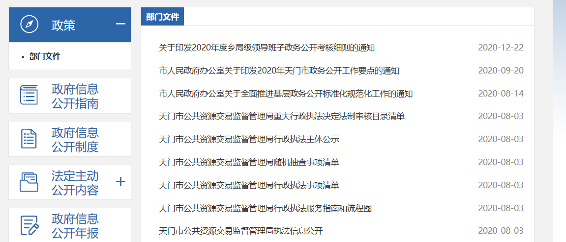 一是公開部門文件。通過政策欄目公開政府網(wǎng)站和政務(wù)新媒體抽查情況、政務(wù)公開考核結(jié)果、政務(wù)公開工作方案等,還公開了天門市公共資源交易監(jiān)督管理局重大行政執(zhí)法決定法制審核目錄清單、行政執(zhí)法主體、隨機抽查事項清單、行政執(zhí)法事項清單、行政執(zhí)法服務(wù)指南和流程圖以及執(zhí)法信息。