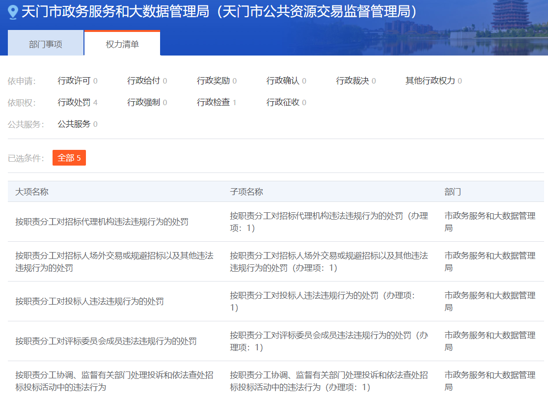 (四)推進公共資源監(jiān)管事項執(zhí)法、處罰信息公開。我局通過政府門戶網(wǎng)站公開了公共資源交易監(jiān)督局的行政執(zhí)法主體和行政執(zhí)法事項清單,還在湖北省公共資源交易信用信息平臺公開了公共資源交易監(jiān)管行政處罰等下信息。