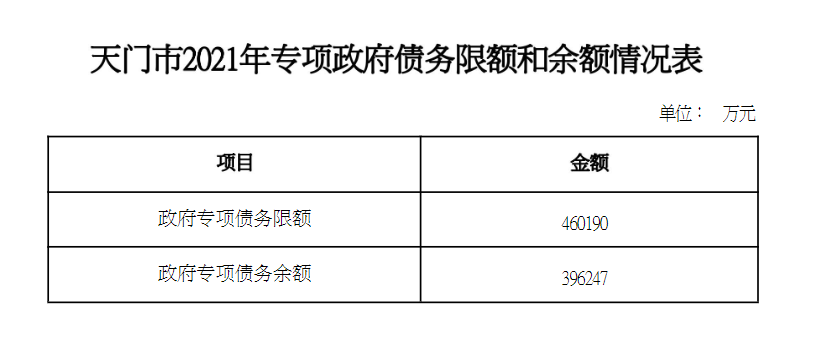 天門市2021年專項政府債務限額和余額情況表