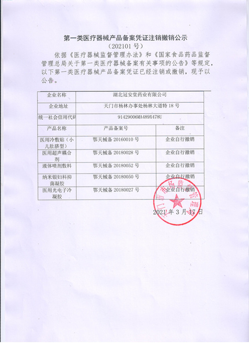 湖北冠安堂藥業(yè)有限公司第一類醫(yī)療器械產(chǎn)品備案憑證注銷撤銷公示