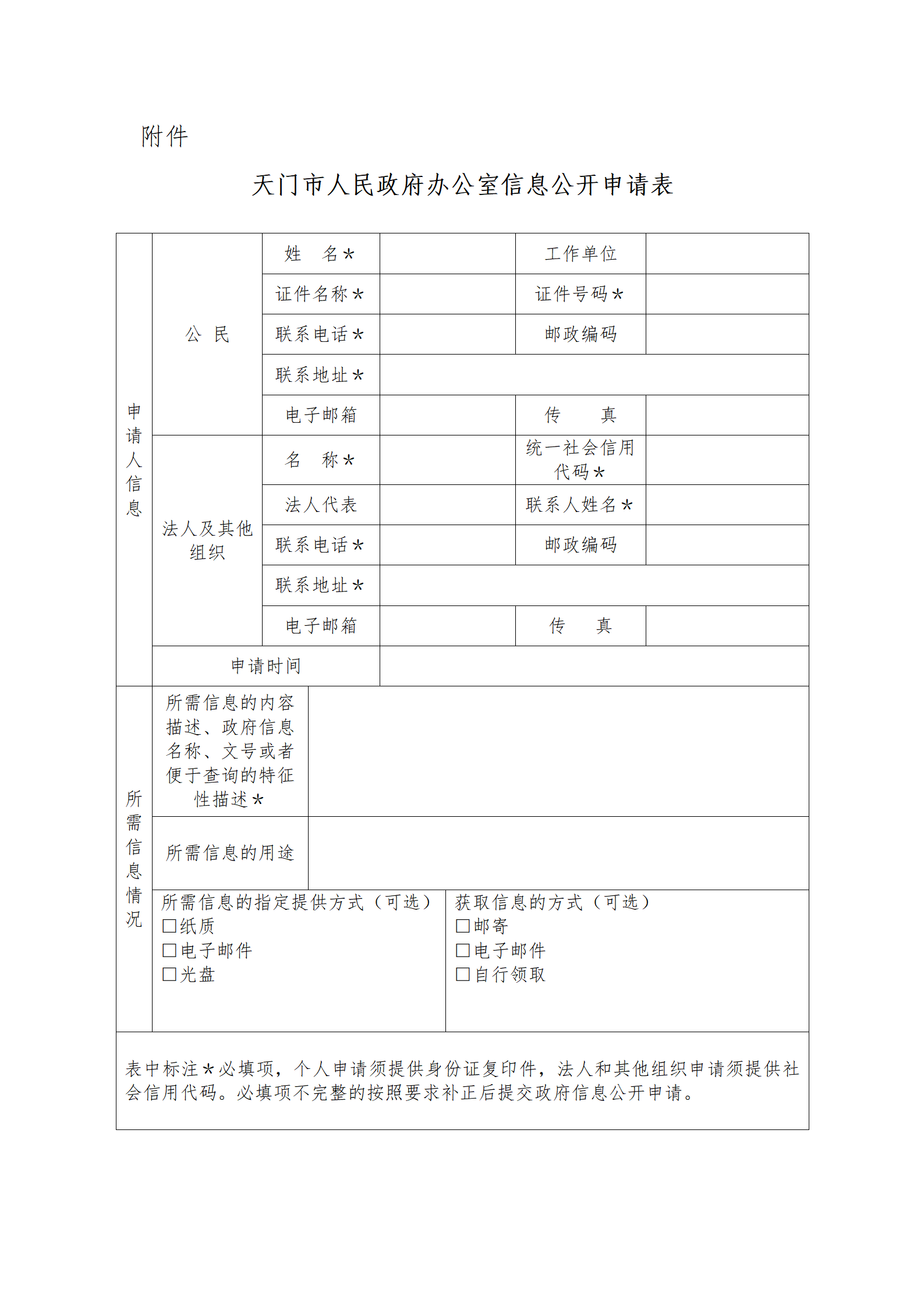 申請人可向本機關申請領取或自行復制《天門市人民政府辦公室信息公開申請表》(附件),也可在天門市人民政府門戶網站上下載電子版本。